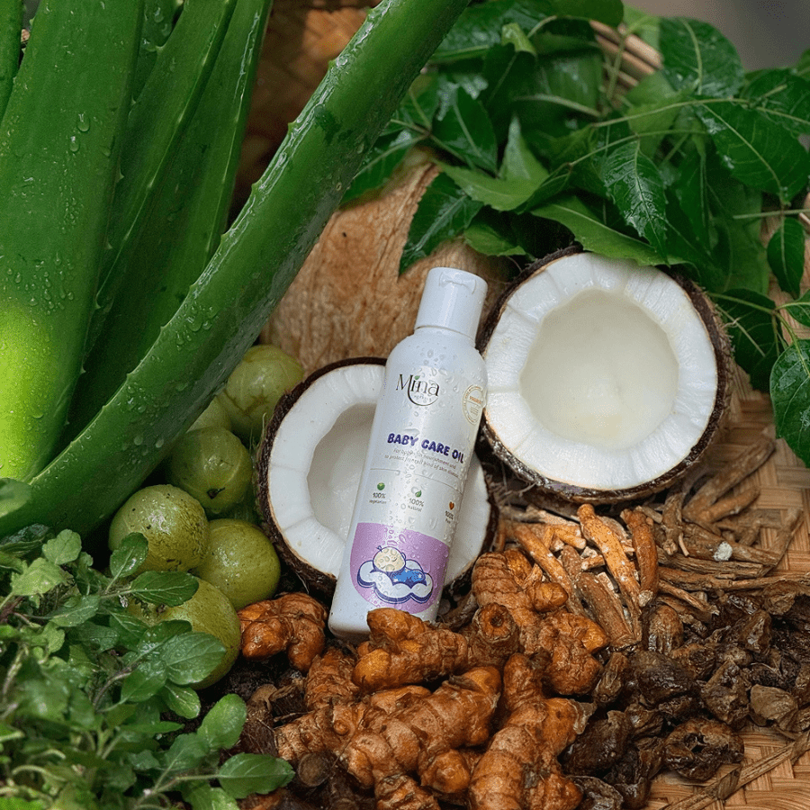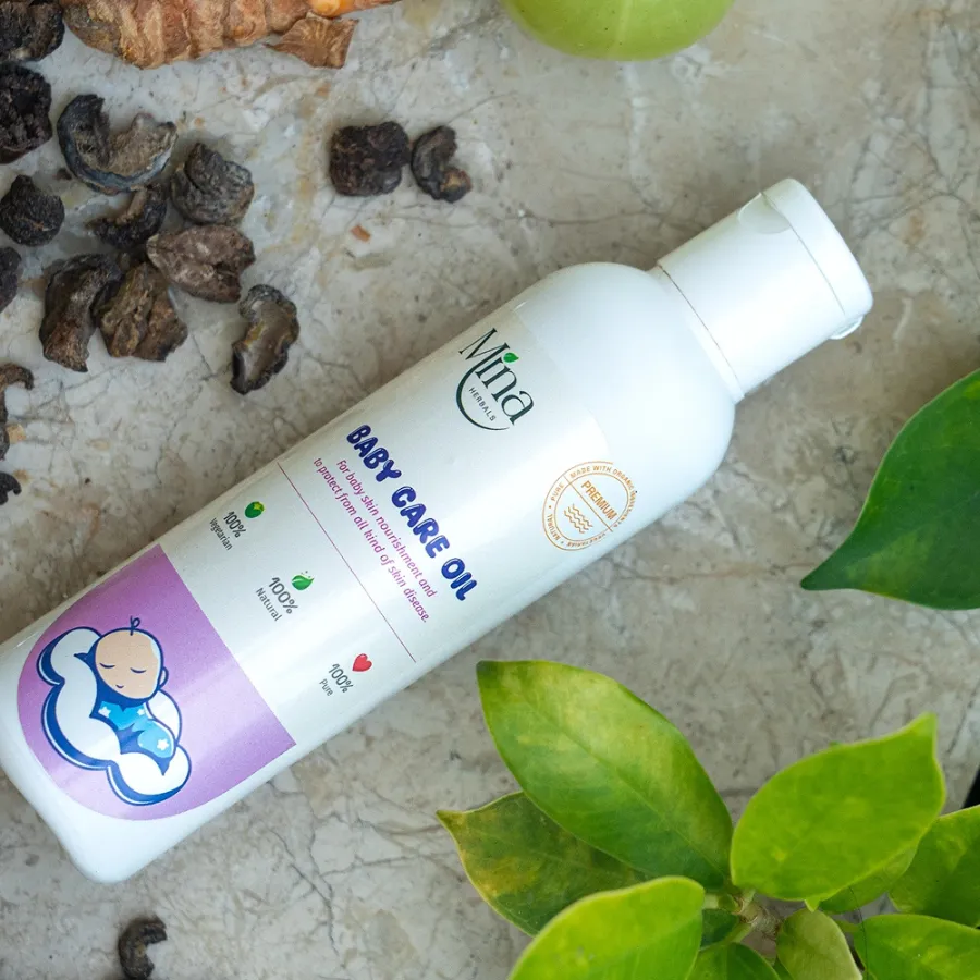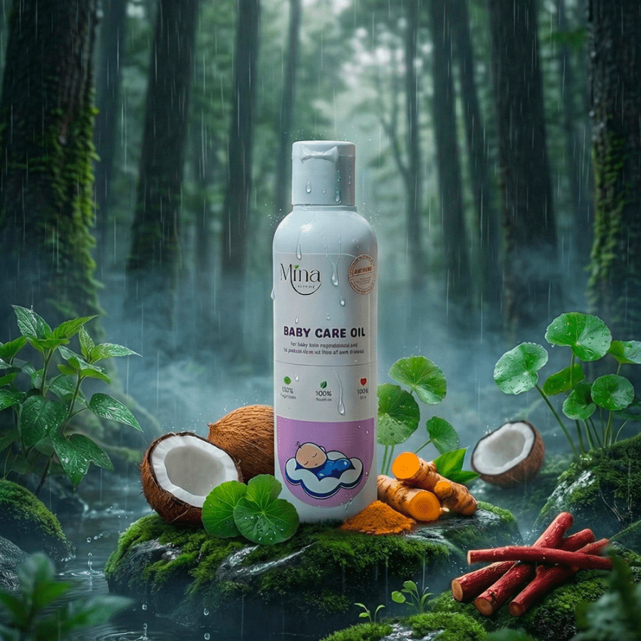 Mina Baby Care Oil is a soft, Ayurvedic blend thoughtfully developed for a baby’s delicate scalp and hair. Made with carefully chosen herbal ingredients known for their mild and nurturing properties, it helps moisturize the scalp, keep hair smooth, and support healthy hair development without irritation.